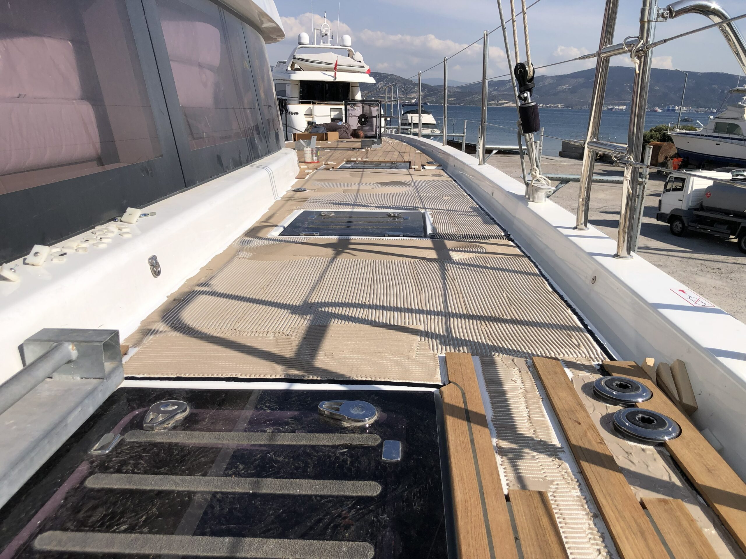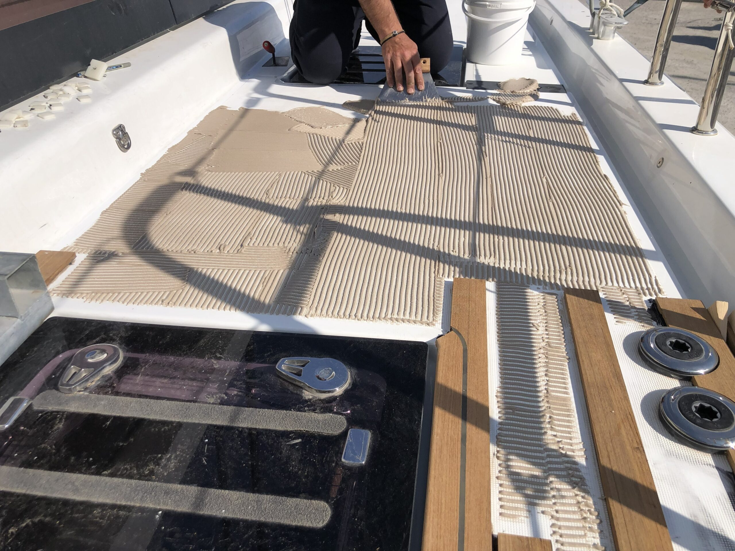 Two-component epoxy adhesive for deck and panel installation, sufficiently fluid for manual or mechanical mixing in container, pourable and trowelable.